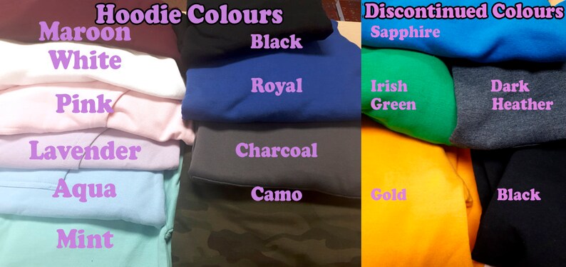 The machine printing these hoodies are using Epson ink, which has been a reputable company for many years and the ink will handle many washes. Stating that, we recommend you wash the shirts inside out to extend the lifespan of the hoodie. For colour options, please refer to the guide in the pictures for the colours name. Please note that the colour of the hoodie may be slightly different than pictured due to monitor settings as well as lighting.