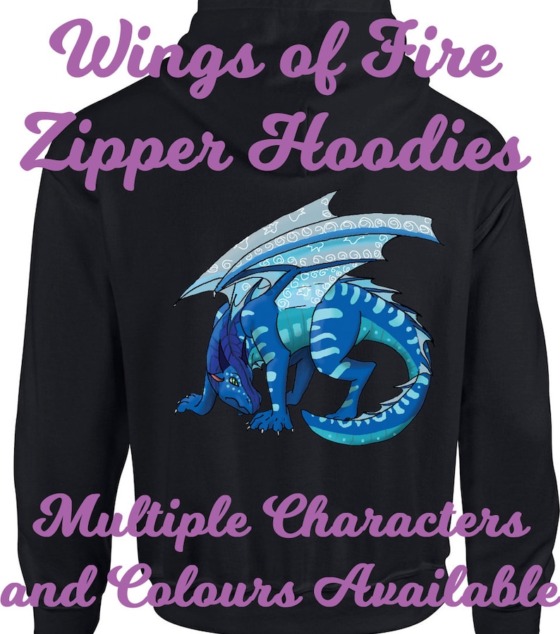 What better way to show off your love for a certain Wings of Fire character than with a hoodie to keep you warm and comfortable? This listing has a selection of characters from Wings of Fire. These are mock ups, and due to the zipper, the design can only be on the back. Even if you are not a fan of Wings of Fire, these cute dragons are sure to please anyone that is a fan of dragons.