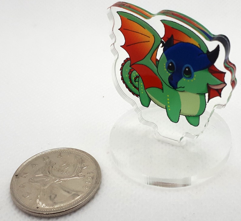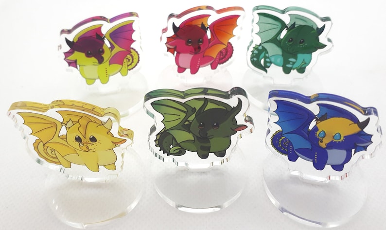 These are cute little acrylic standees of some of your favourite Wings of Fire characters! Made of acrylic and double sided, these little guys will show up on both sides of the standee, and fully capable of standing up on their own. This means you can use them for decoration, or as a replacement of most board game pieces. Want Glory instead of the, most of the time, boring game pieces on game night? Now you can!