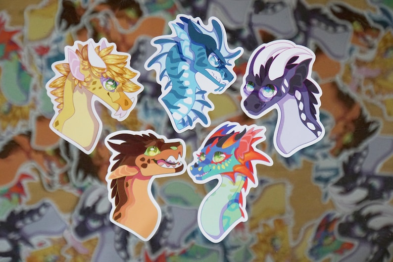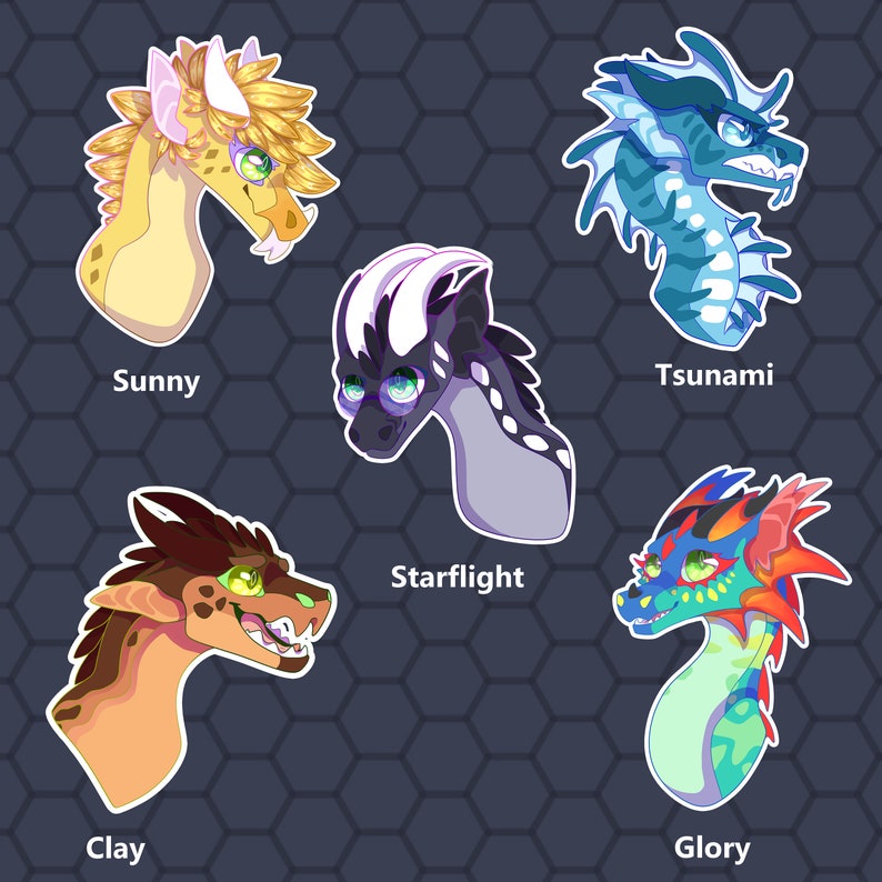 Three inch Vinyl Stickers inspired by the dragonets of destiny from the best selling book series "Wings of Fire" by Tui. T. Sutherland.