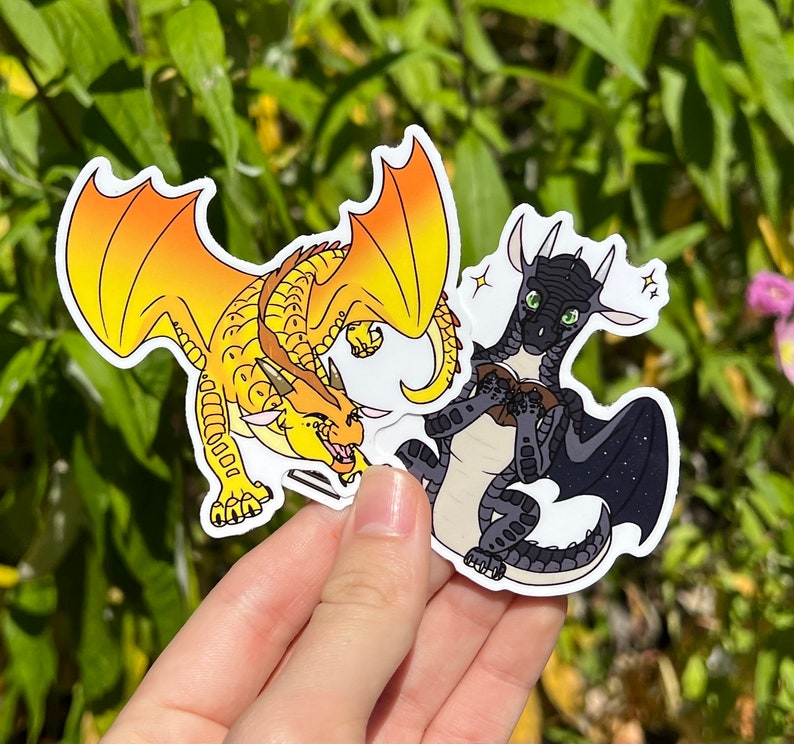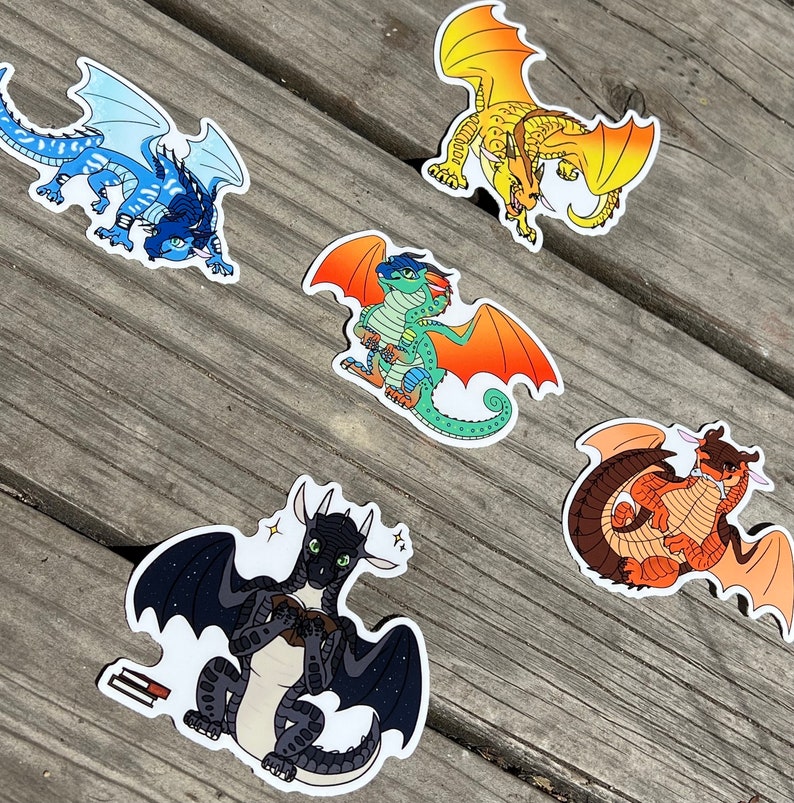 Vinyl, gloss stickers inspired by the original five dragonets of prophecy. Glory, Tsunami, Sunny, Starflight and Clay would make perfect companions for for bottles, laptops, windows, and more!
