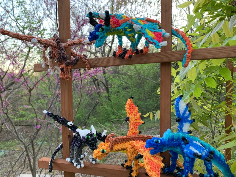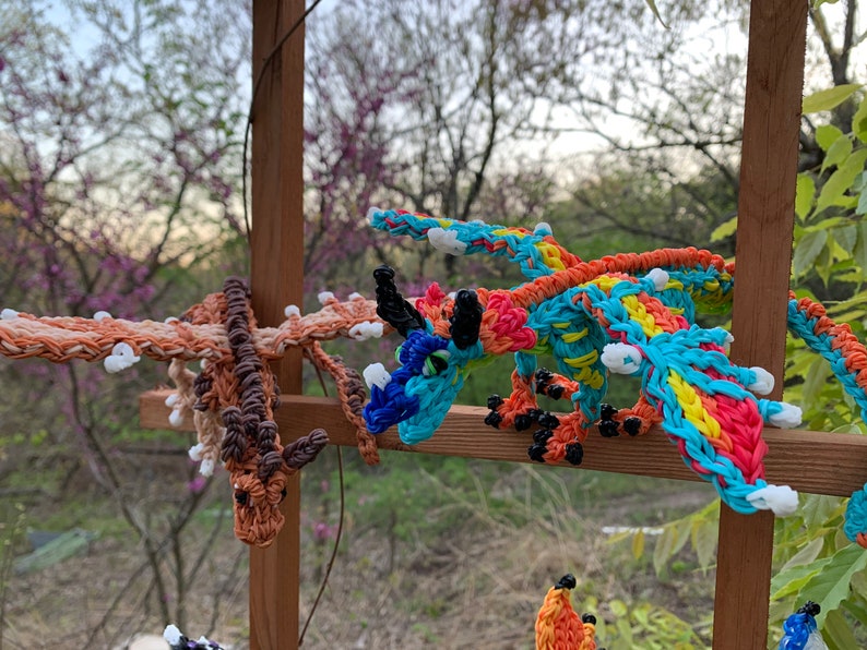 Made to order. Rainbow Loom Rubber Band Dragons from Wings of Fire- The Five Dragonets of Prophecy. Tsunami the Seawing, Clay the Mudwing, Starflight the Nightwing, Sunny the Sandwing, and Glory the Rainwing or alternate pink/navy Rainwing. Please indicate which Rainwing you want as part of your pack. All medium size. Design by Maile.