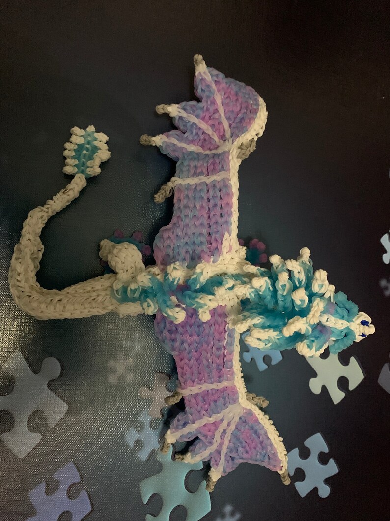Rainbow Loom Rubber Band Dragon from Wings of Fire. Winter the Icewing. Design by Courtney Nicole at the YouTube channel How to Loom Your Dragon.