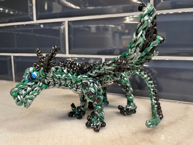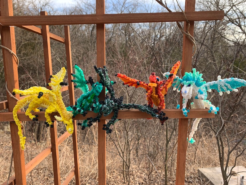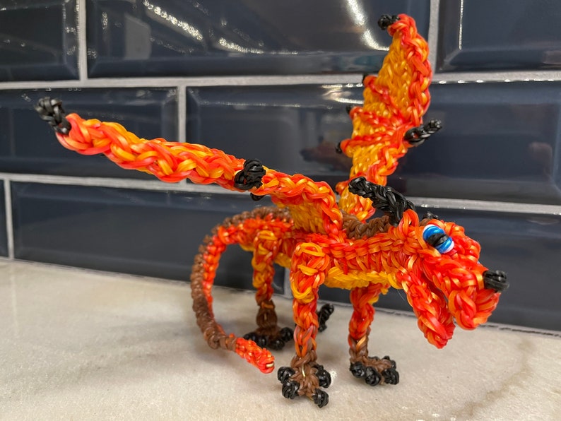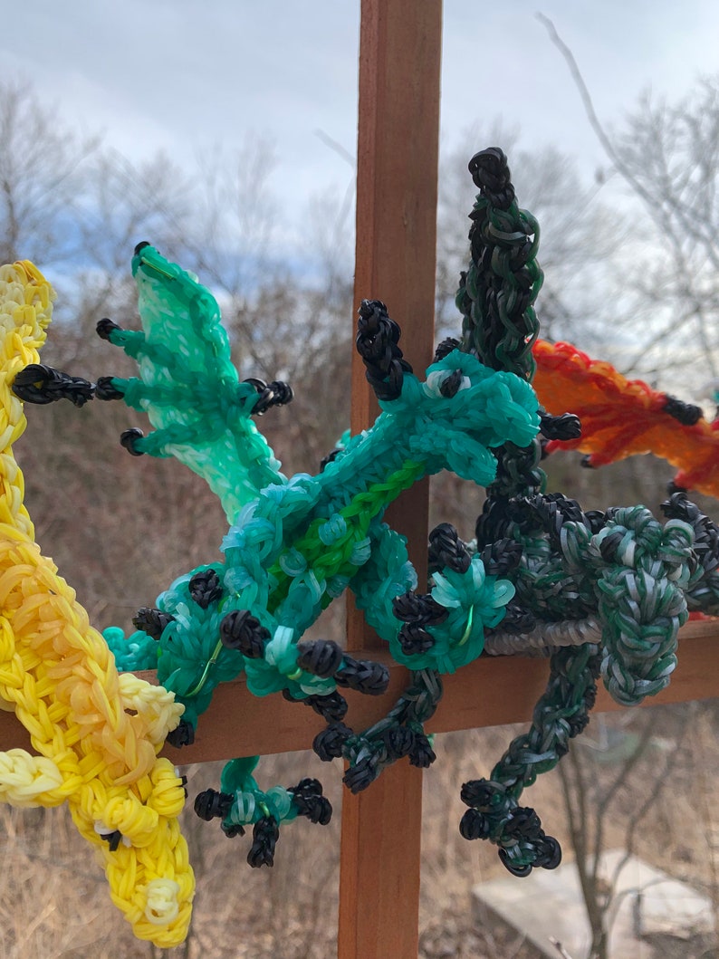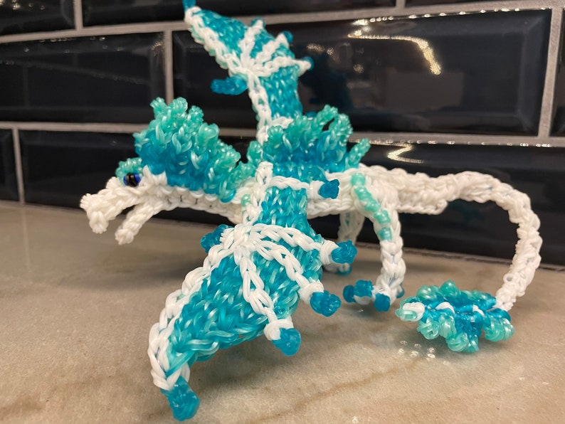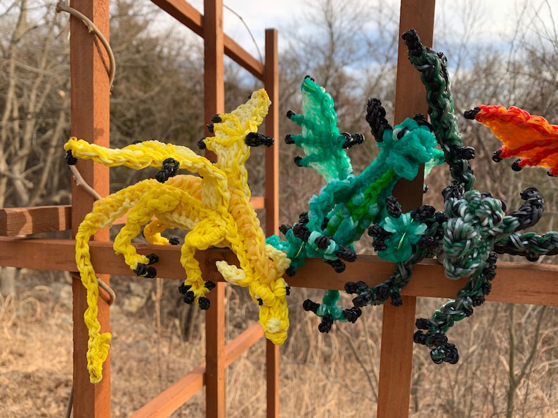 One set in stock. Rainbow Loom Rubber Band Dragon from Wings of Fire. Peril the Skywing, Prince Winter the Icewing, Moonwatcher the Nightwing, Qibli the Sandwing, Turtle the seawing. Medium. The Jade Mountain Prophecy. Design by Maile