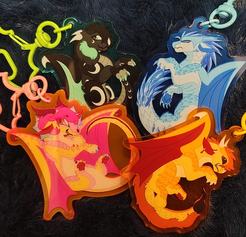 Here's three members of the Jade Winglet! Qibli, Winter, and Moonwatcher are all here! They are each 2.5 inches on their longest side and come with a cool translucent color effect around them. They also have a layer of protective film on each side that will need to be peeled off to really make them shine!