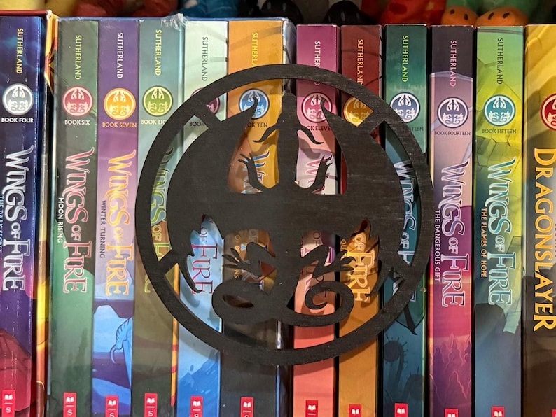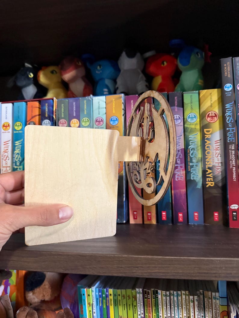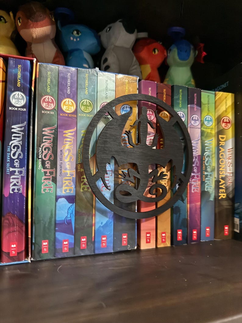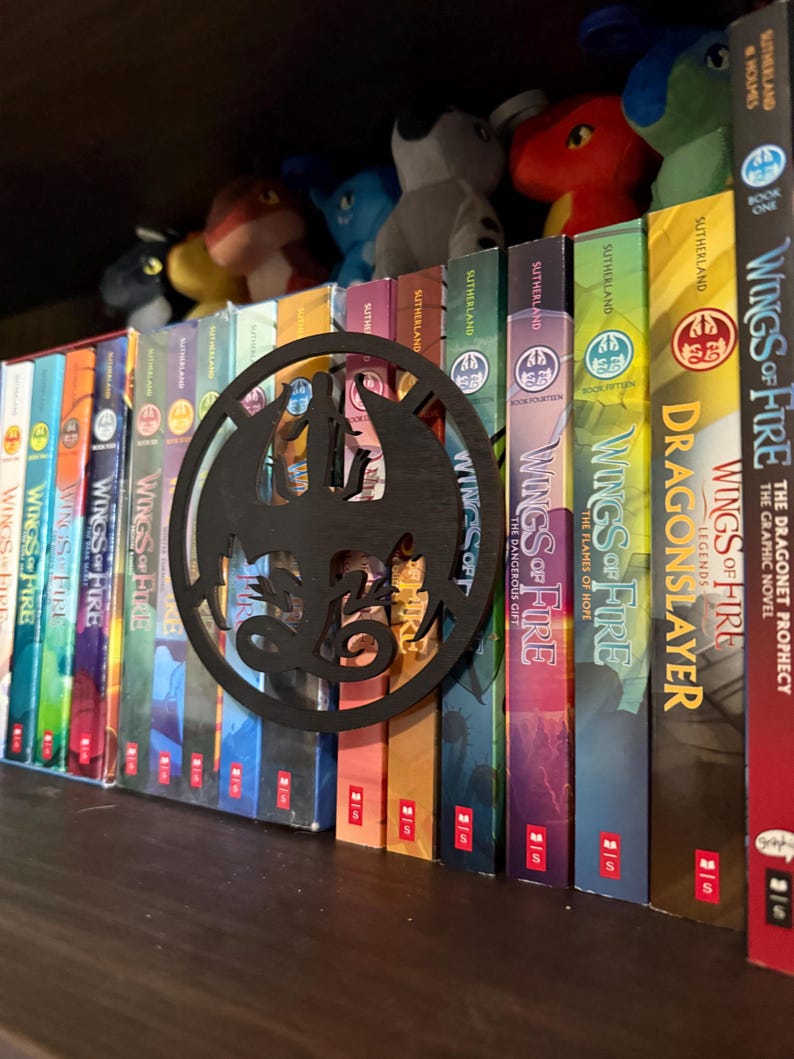 Add these 1/8” Baltic birch laser cut and hand painted dragon to your bookshelf! The custom crafted wood insert can be placed between books at buyers desired height and is left unpainted to protect the books. The custom bracket allows for space between the dragons and the book also!
