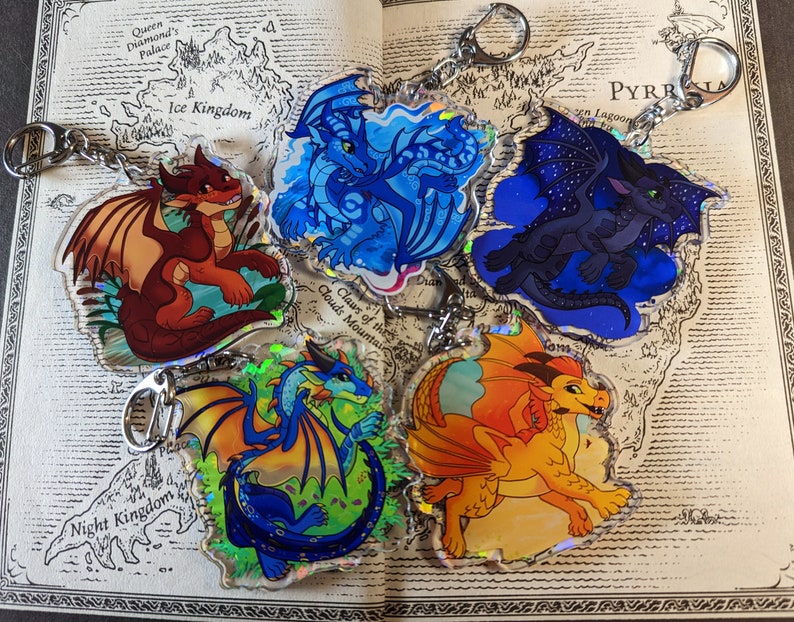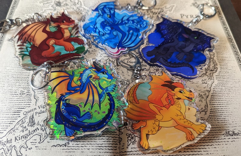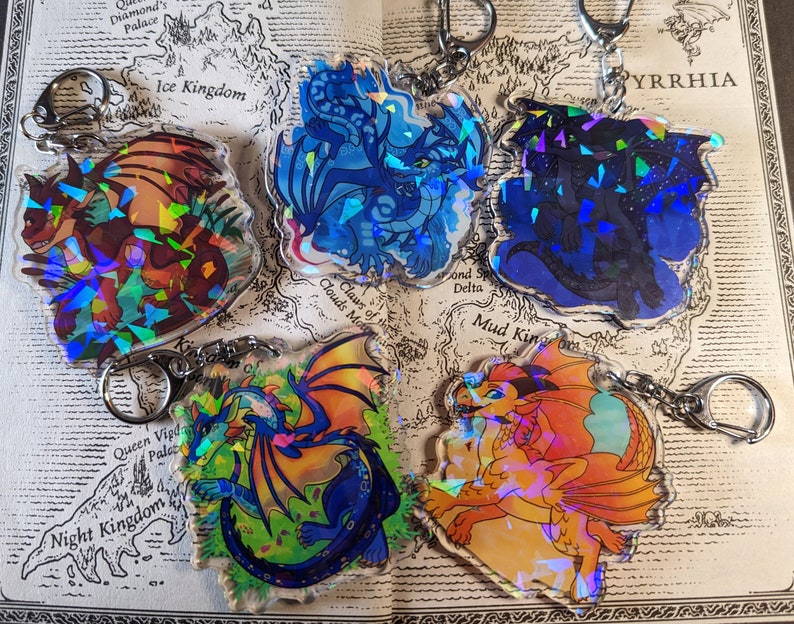 This is a 2.5 inch, clear acrylic charm collection with a secure lobster clasp. The artwork is double sided! ~ One side has a holographic