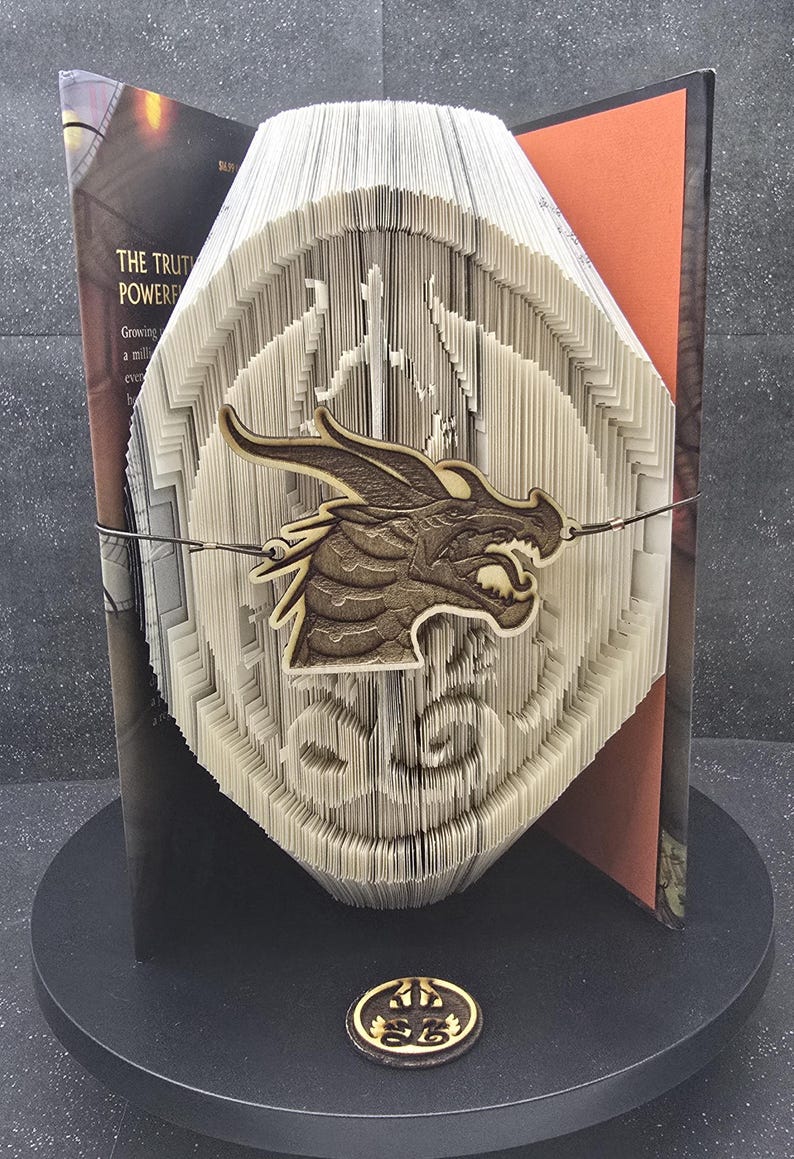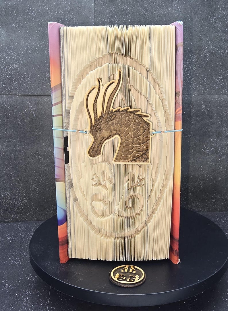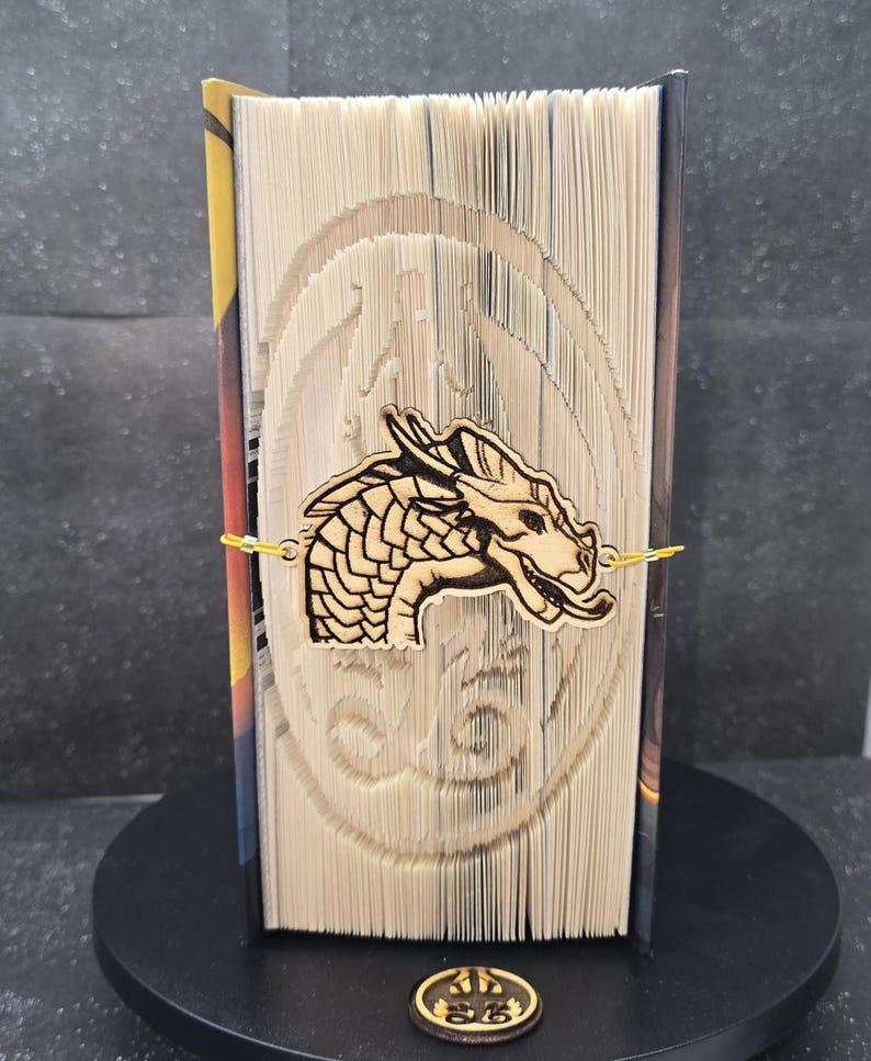 Wings of Fire Fan! You will love this one of a kind Book art. This is made from hard cover books of the Wings of Fire Series, "The Dragonet Prophecy" by Tui T. Sutherland. The sculpture is made from folded pages of the book itself, creating a bas-relief effect. The book can be unfolded to read if desired. It features the symbol of the Wings of Fire series as the sculpture. It is held together by a leather rope with a wooden carving of the dragon that is featured on the front of the book. More books to come in the series featuring the dragon on the front cover.