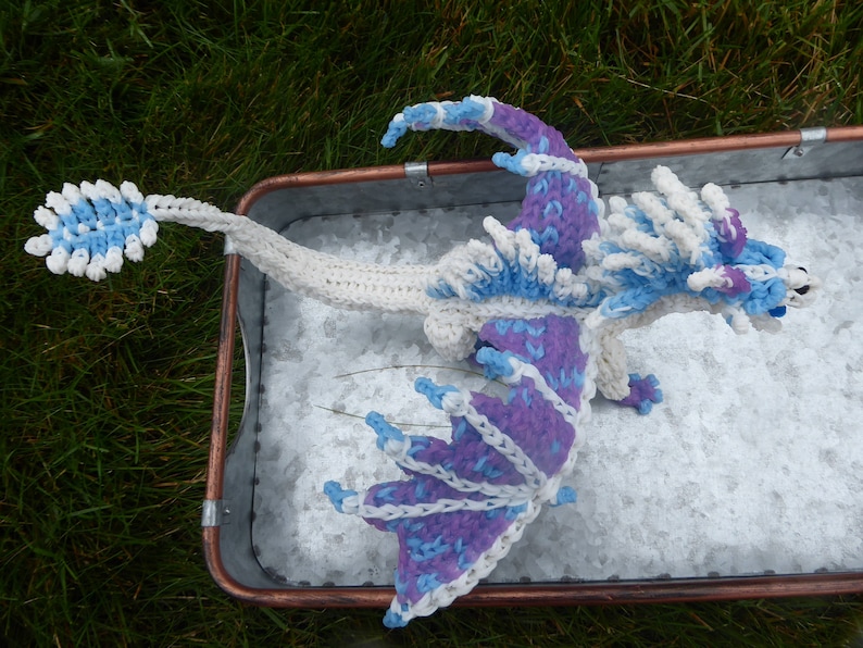 This dragon is made with color-changing solar bands. When outdoors, some of his blue horns and wings will change to purple.(shown in pictures 1 - 5)