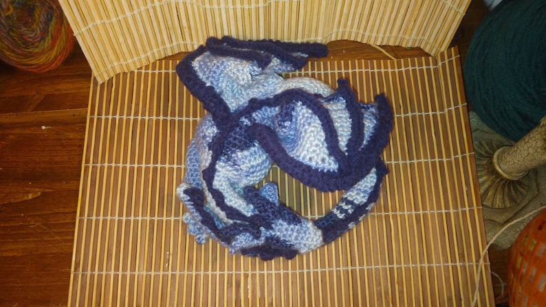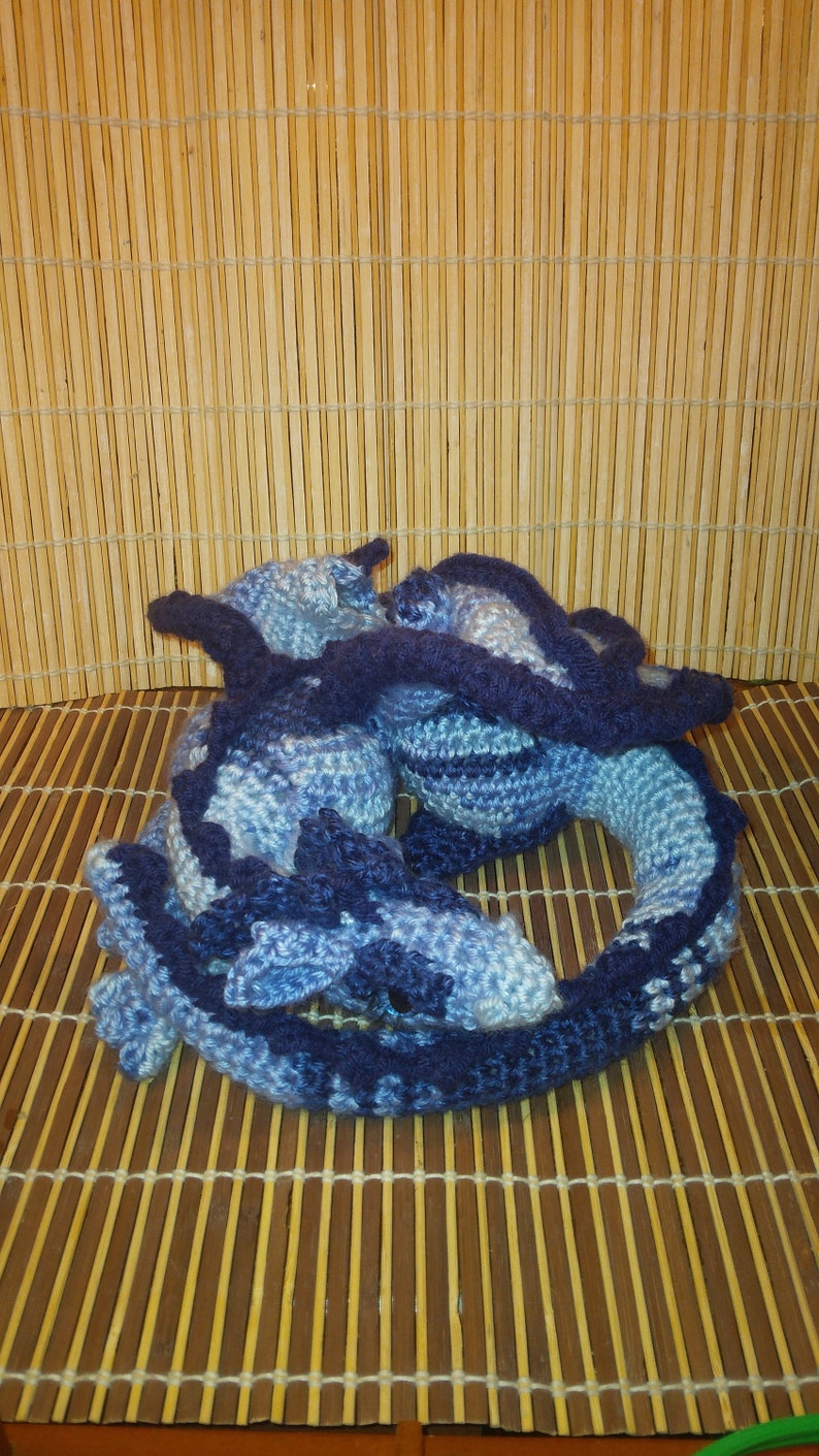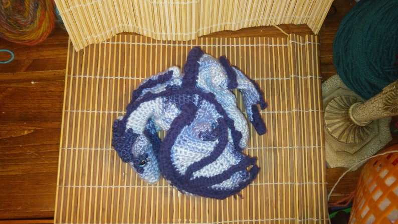 Wired and posed in curled up laying down pose. you can use color changing yarn gor scaling look( see post for sea dragon)