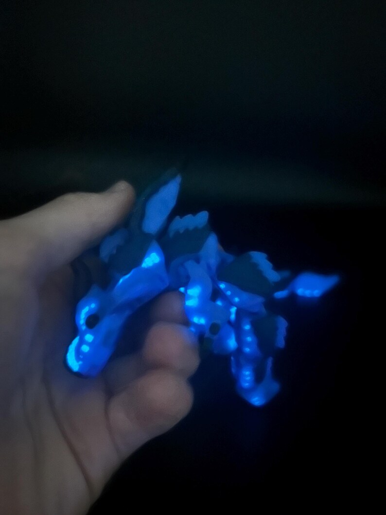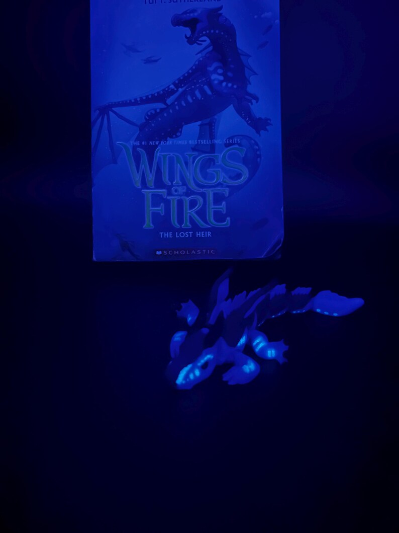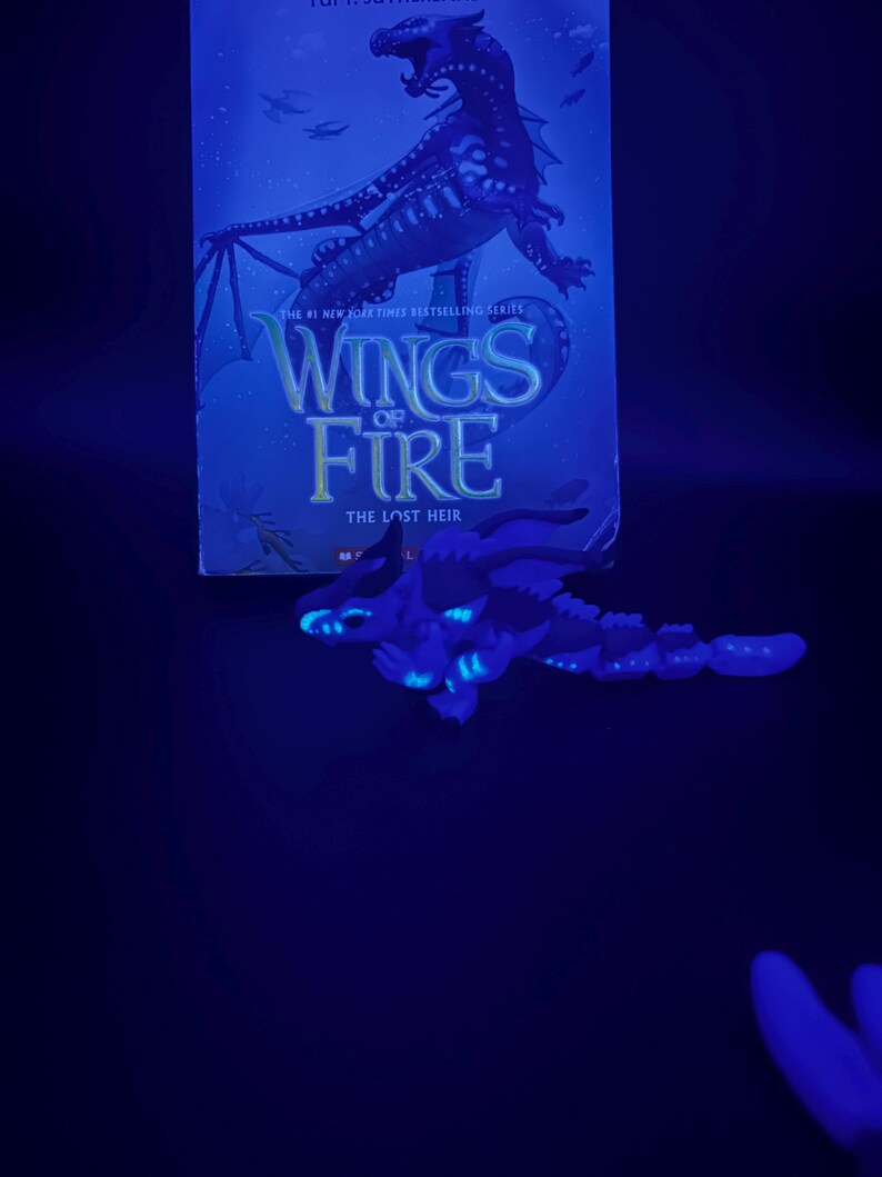 Based of the loved book series wings of fire sea wing tribe 🌊💧. This flexible baby dragon glows in the dark!! It is perfect for wings of fire fans. Made with a 3D printed you won’t be able to find this anywhere els. And I am currently working on the other tribes and will be releasing them so stay tuned to my shop 🤩👋.