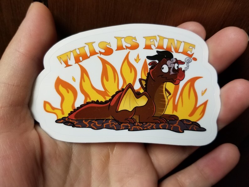 This is fine! No really...Peril is having a great time. She loves the flames! You will receive one sticker featuring your favorite hot-headed Skywing character from Tui. T. Sutherland's beloved series, Wings of Fire.