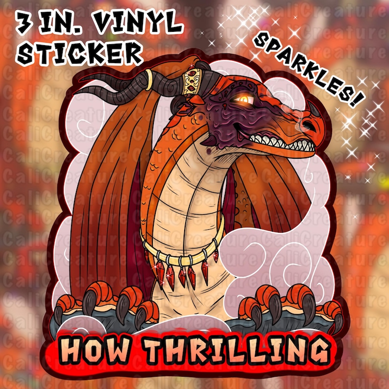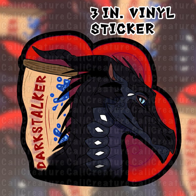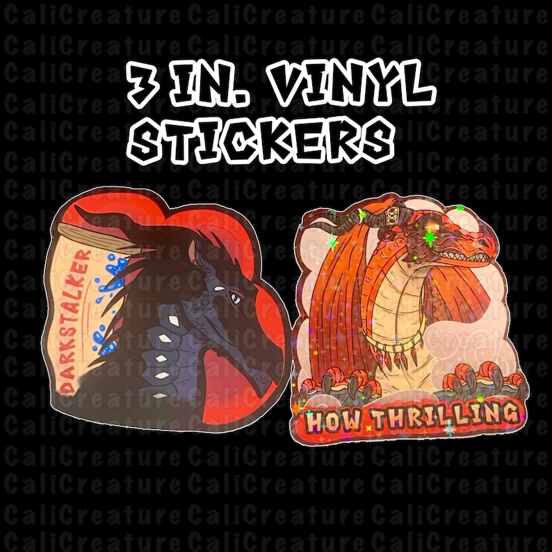 Water resistant vinyl stickers of two iconic villains in the dragon Kingdoms, terrifying Darkstalker and thrilling Queen Scarlet! Each sticker is 3” tall. Queen Scarlet comes with sparkles on her sticker, depicting a glittery starry shine to match her regal ferocity.
