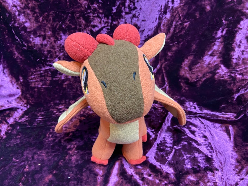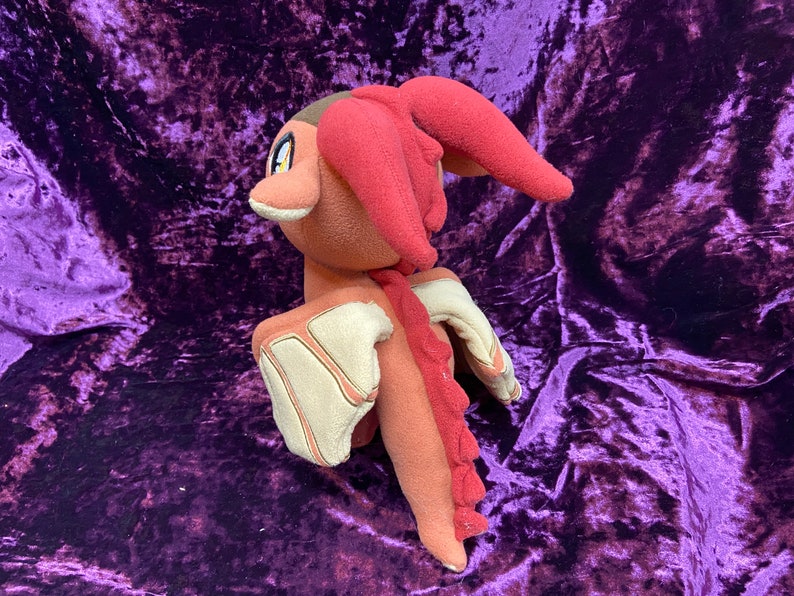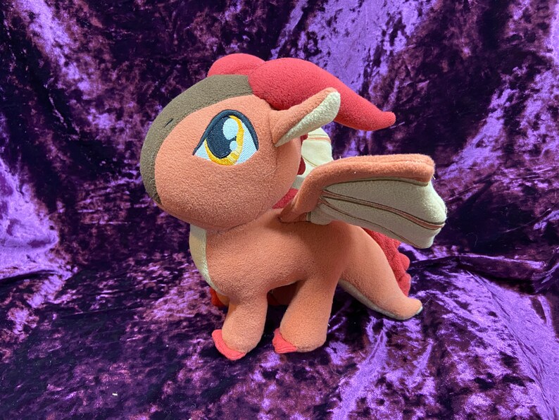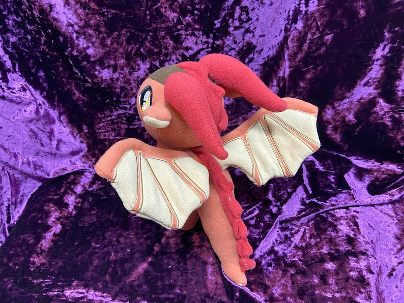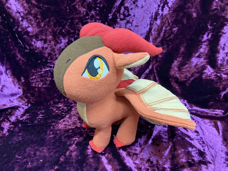 Clay, is a character from the Wings of Fire book series. This cute plush is roughly 9 ½ in tall, and 12 in long. You have a choice of "posable" (wire) or “flappable” (no wire) wings. Sunny in picture is with wire.