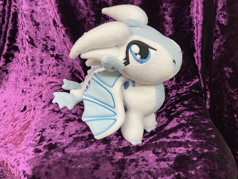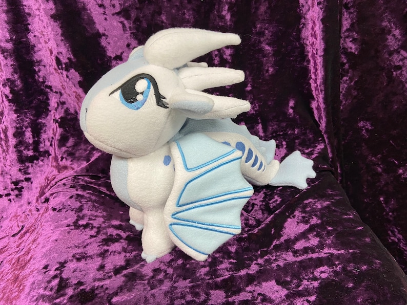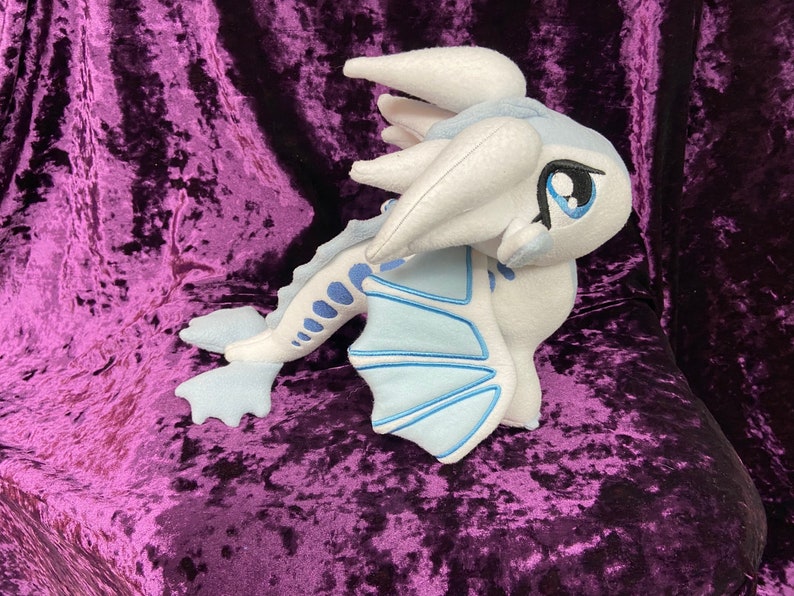 Queen Snowfall, the IceWing, from Wings of Fire! This cute little gal is roughly 9 ½ in tall, and 12 in long. Choice of posable or “flappable” wings. (Wire or no wire in wings) Note picture is shown with flappable wings. This plush is hand made so each one will be a little different, and unique as are they made to order.