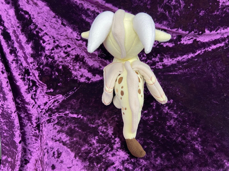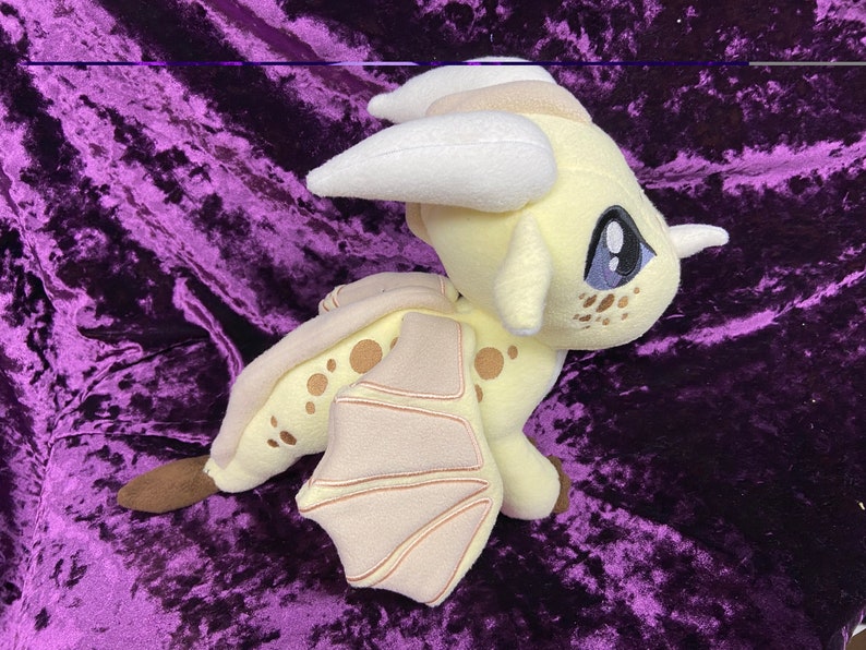 Qibli, the Sandwing,from Wings of Fire! This cute little guy is roughly 9 ½ in tall, and 12 in long. Choice of posable or “flappable” wings. (Wire or no wire in wings) Note picture is shown with posable wings. This plush is hand made so each one will be a little different, and unique as are they made to order.