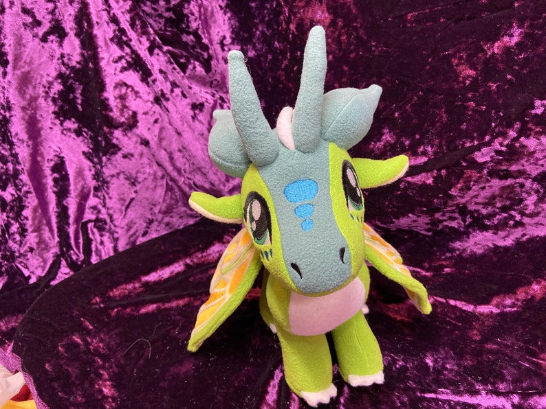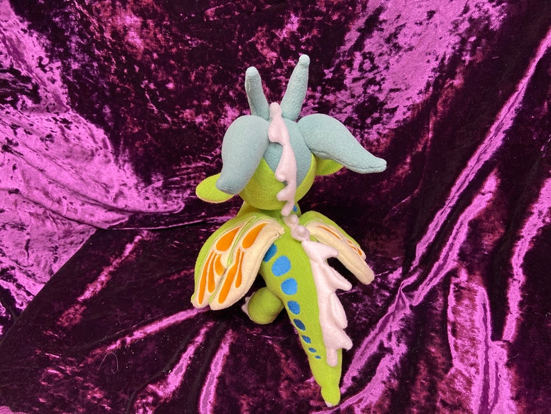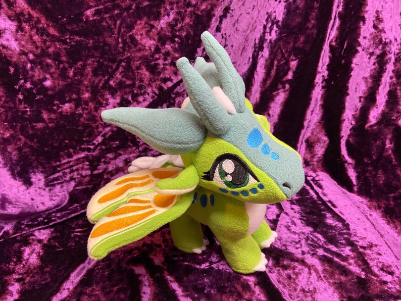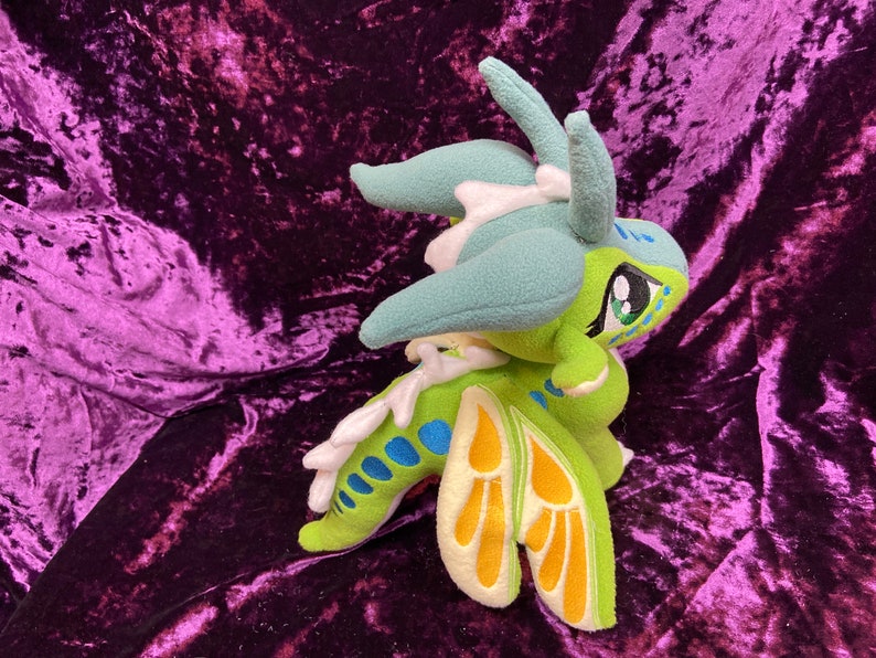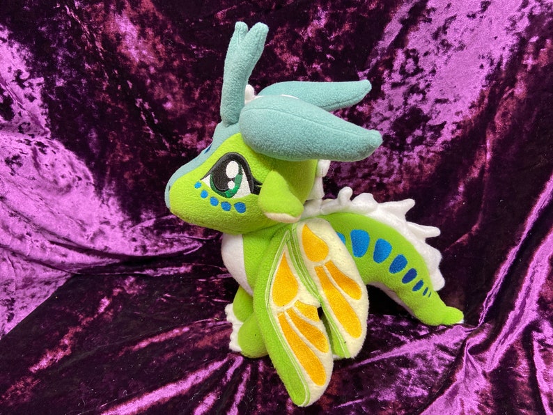 Luna, the silkwing, from Wings of Fire! This cute little girl is roughly 9 ½ in tall, and 12 in long. Choice of posable or “flappable” wings. (Wire or no wire in wings) Note picture is shown with posable wings. This plush is hand made so each one will be a little different, and unique as are they made to order.