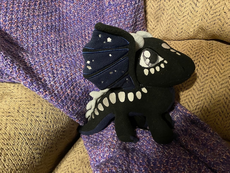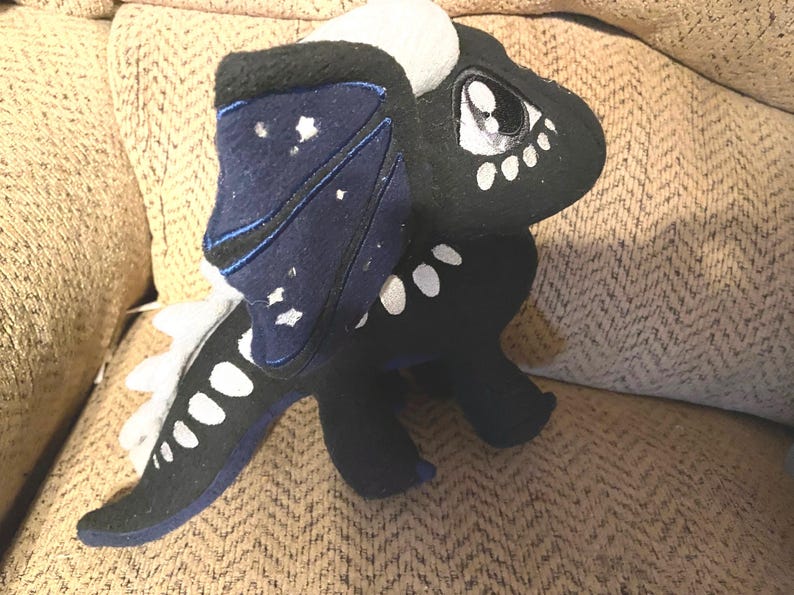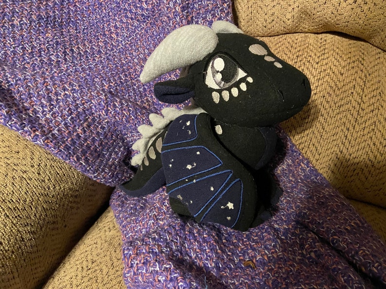 Deathbringer, the NightWing, from Wings of Fire! This cute little guy is roughly 9 ½ in tall, and 12” long. He is made with wire, so wings are posable.