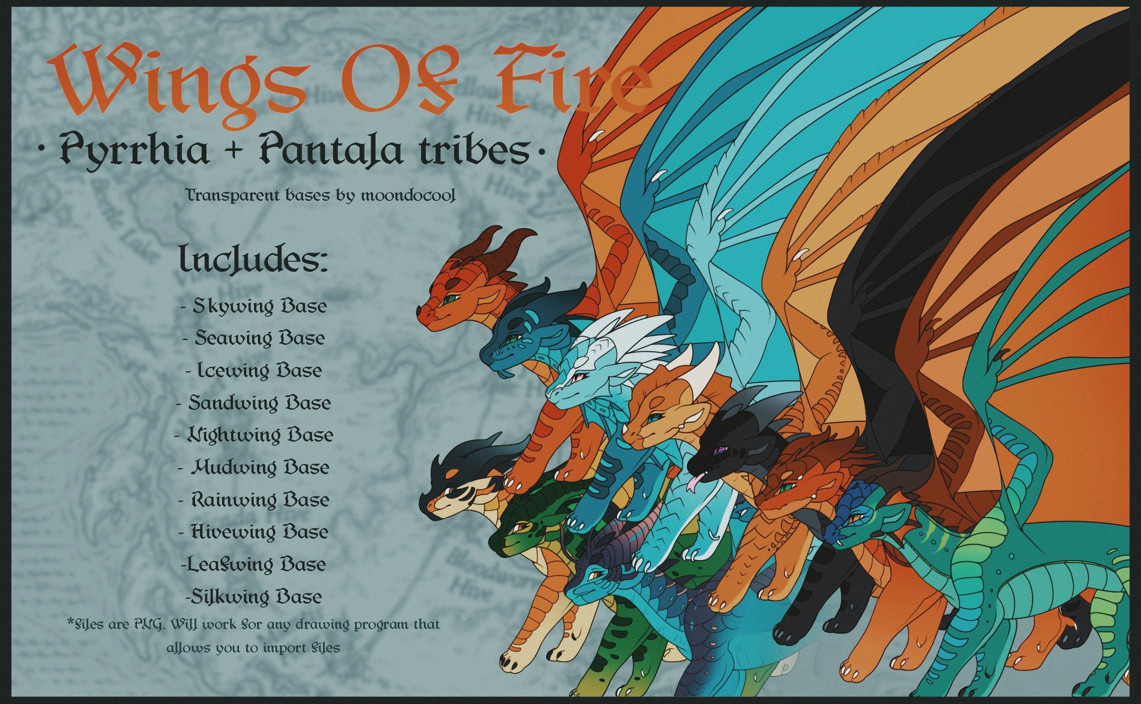 This product contains transparent bases for all ten tribes of the Wings of Fire franchise. Files are in a PNG format