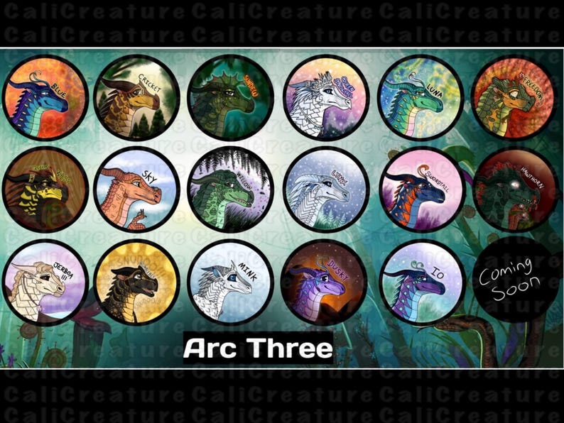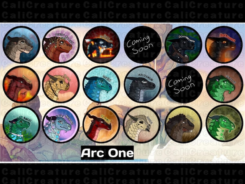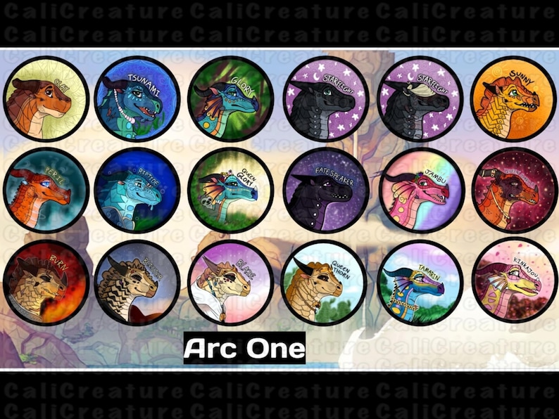 Arc one: Clay, Tsunami, Glory, Queen Glory (please specify Queen or not Queen), Starflight (with or without bandaged eyes and scars, please specify which), Sunny, Peril, Riptide, Fatespeaker, Jambu, Queen Scarlet, Burn, Blister, Blaze, Queen Thorn, Queen Battlewinner, Anemone, Tamarin, Kinkajou, Crocodile, Queen Moorhen, Deathbringer, Morrowseer, Kestrel, Dune, Webs, Mastermind, Nautilus, Auklet, Flame, Viper, Ochre, Squid